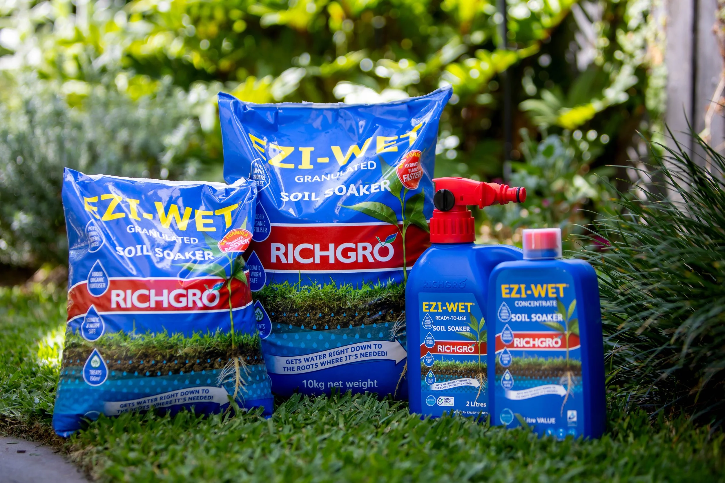 EZI-WET is a soil wetting agent whose main function is to help soils absorb water. Applying EZI-WET to your garden, pot plants and lawn will assist water penetration, improve the efficiency of any fertilisers used, reduce water runoff and help eliminate dry patches.